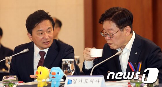 이재명 경기도지사와 원희룡 제주도지사가 지난 7월 30일 오전 서울 여의도 국회 의원회관에서 열린 국회 기본소득 연구포럼 창립총회 및 세미나에서 만나 이야기를 나누고 있다.